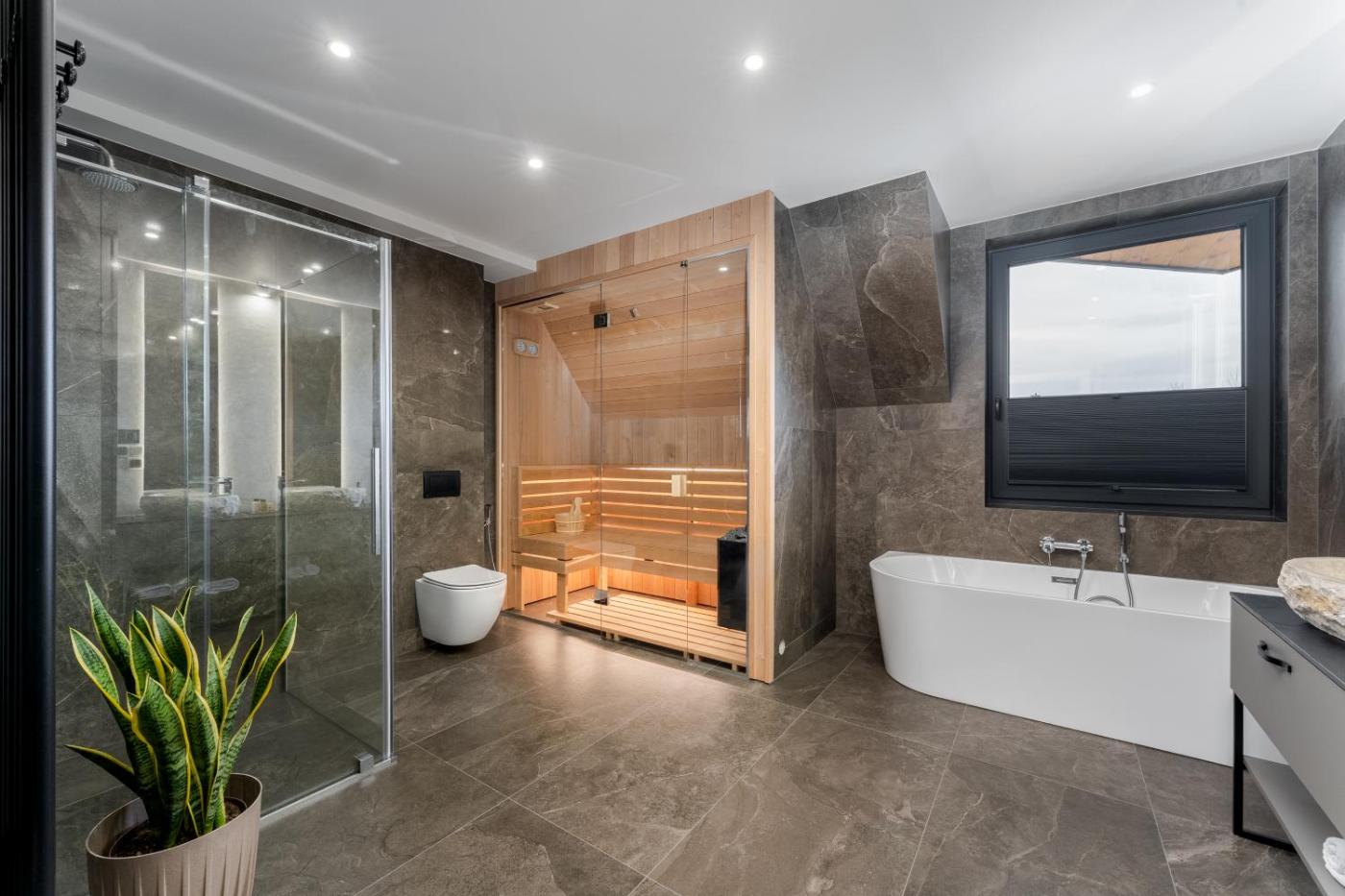 Apartament typu Suite z sauną. The sauna is the standout feature of this suite. Boasting 2 bedrooms, this spacious suite has 1 bathroom with a bath, a seating area and terraceyou can relax. The well-equipped kitchen has a stovetop, a refrigerator, a dishwasher and kitchenware. The air-conditioned suite features a flat-screen TV, a washing machine, soundproof walls, a tea and coffee maker as well as garden views. The unit offers 3 beds. Apartament typu Suite - 5 osobowy. Powierzchnia pokoju ok.: 77 mkw. ;